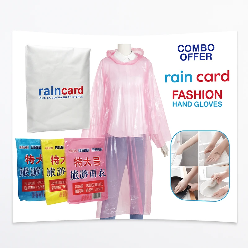 এই কম্বো প্যাকেজ-এ রয়েছে ৫টি Rain Card (রেইন কোট টাইপ ডিসপোজেবল রেইনপ্রুফ কভার) এবং ২টি স্টাইলিশ, টেকসই Hand Gloves। Rain Card বিশেষভাবে ডিজাইন করা হয়েছে যাতে হালকা ও ভারী বৃষ্টিতেও সহজে ভিজে না যান। এটি পকেট সাইজে ভাঁজ করে বহনযোগ্য, ফলে যে কোনও সময় ব্যবহার করা যায়।
